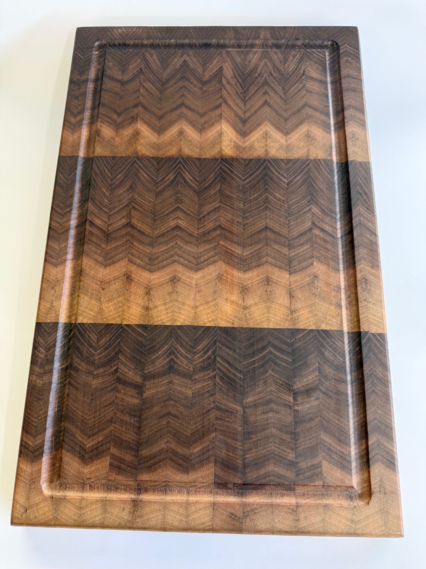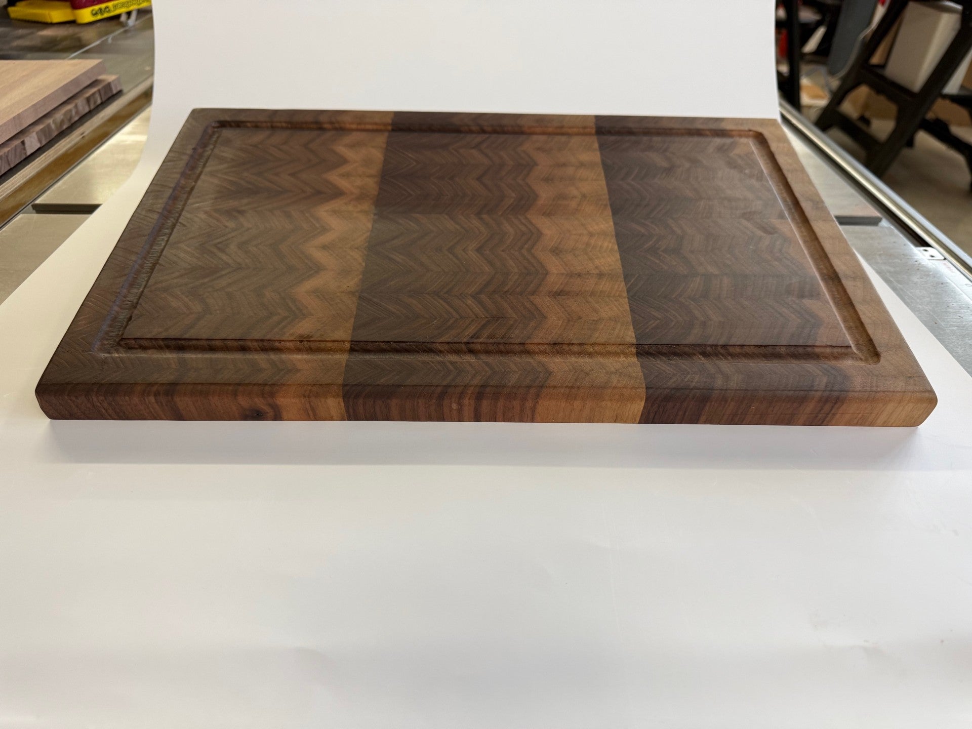 Handmade walnut end grain butcher block board made from locally sourced superior walnut. This board measures 17 1/2" long by 11' wide and 1' thick.