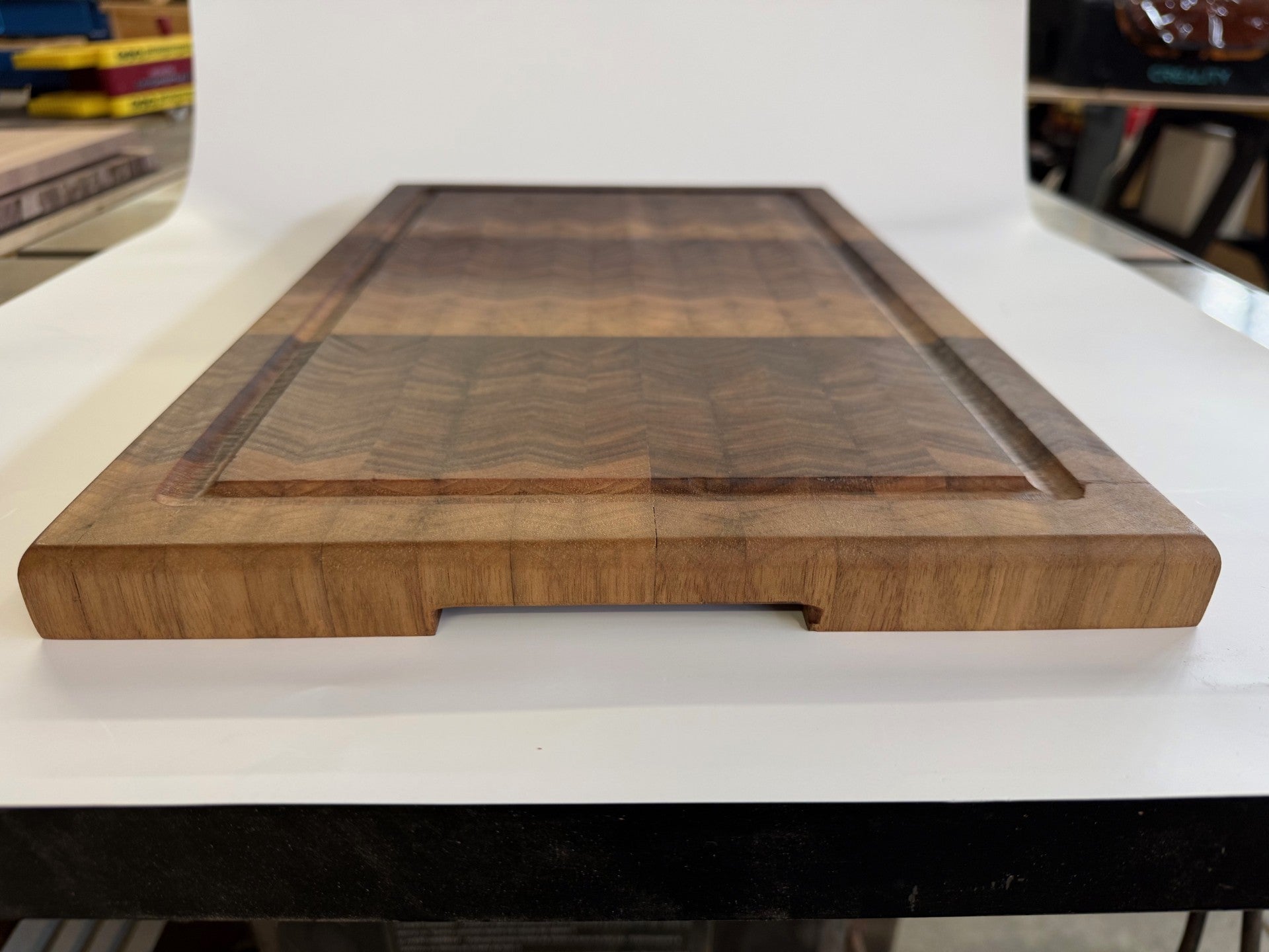 This board has a juice groove and hand holds. Rubber feet can be added for no extra cost if desired.